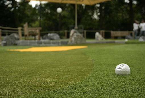 Das Ausholen mit dem Schläger über Kniehöhe ist nicht erlaubt, da auf der Anlage nur “Putten“ erlaubt ist.